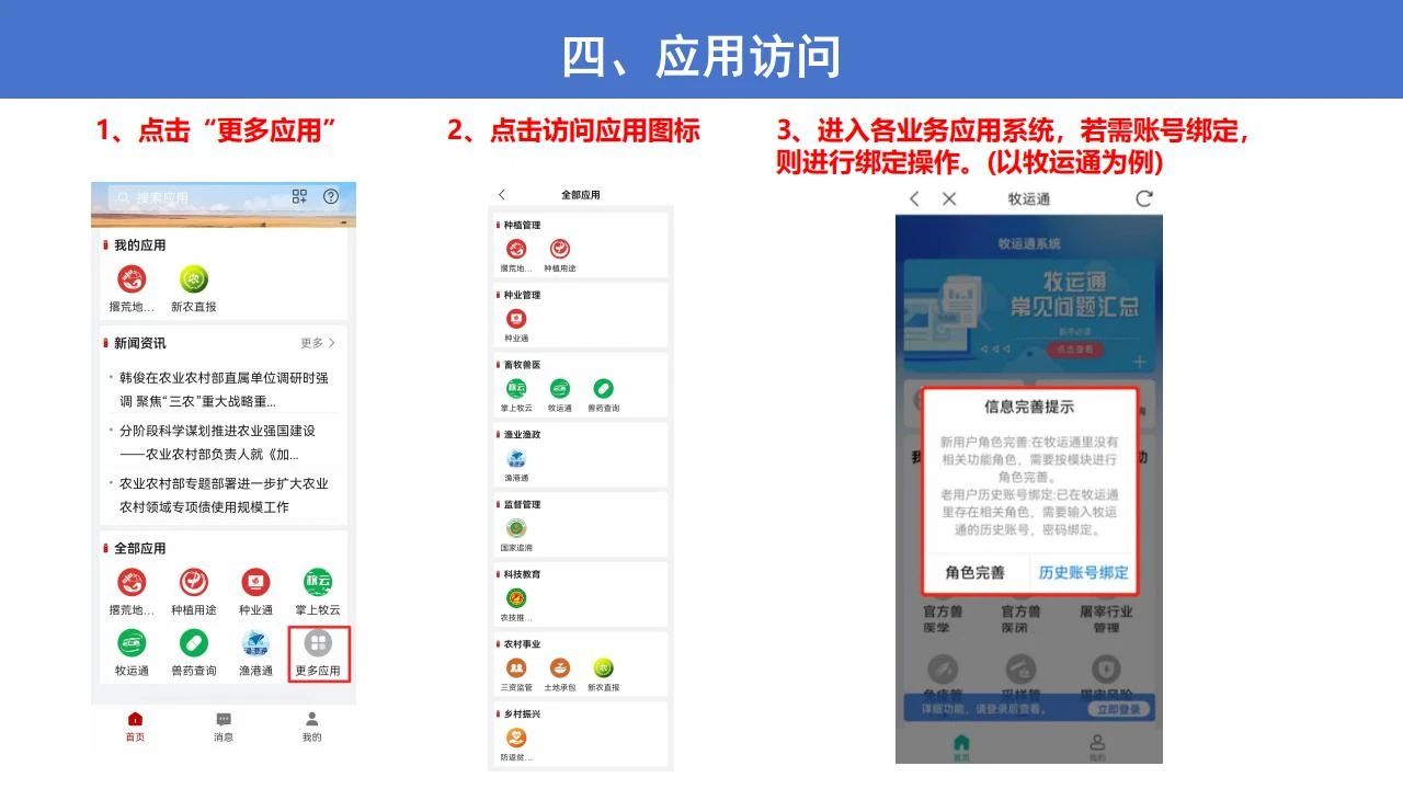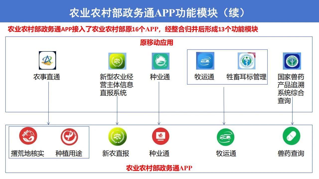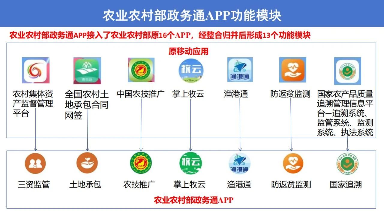 政务通APP有效整合了原有“种业通”、“掌上牧云”、“牧运通”、“渔港通”、“新农直报”、“农事直通”、“防返贫监测”等应用程序的政务功能和核心数据资源,实现了“一次登录、一站式办理”,减少了操作复杂度,节约了时间成本,切实提高了基层工作效率。农业农村部将持续优化迭代APP功能,拓展增加小程序等服务方式,不断提升基层用户的体验感和满意度。